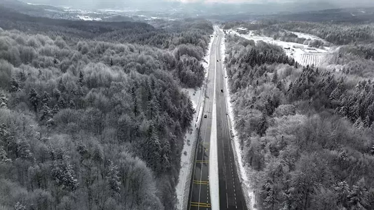 Drone kayıtları, bölgedeki beyaz örtünün ormanlık alanlar ve otoyol geçiş noktaları üzerindeki etkisini havadan gösteriyor. Görüntülerde karla kaplı yolların yanı sıra kar yağışının kısa süreli ama etkili olduğu bölgeler de net biçimde izlenebiliyor.