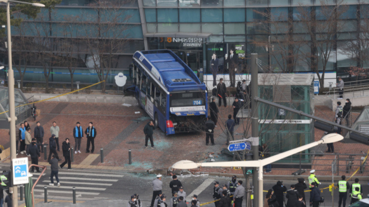 Güney Kore’nin başkenti Seul’de bugün öğleden sonra bir belediye otobüsü kaldırıma çıkarak NH NongHyup (NongHyup Bank) binasının cam cephesine çarptı. Kazada ilk belirlemelere göre 13 kişi yaralandı; yaralılardan ikisinin durumu ciddi. Polis ve itfaiye ekipleri olay yerinde müdahale ediyor, soruşturma başlatıldı.