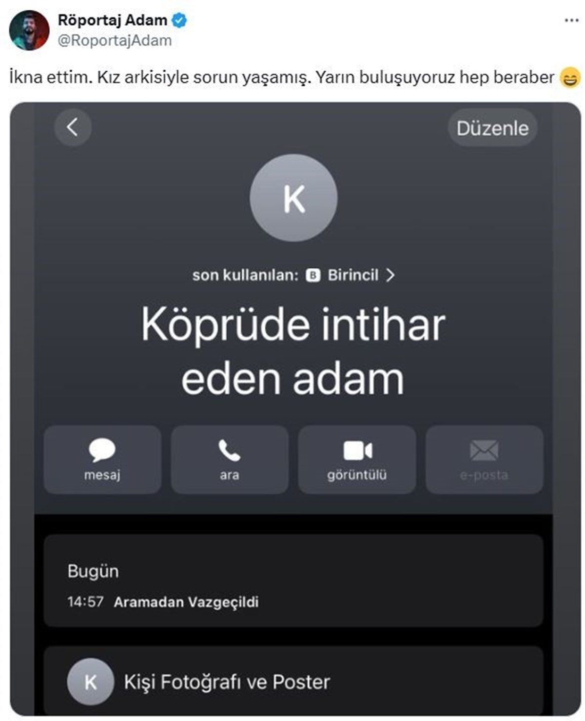 SOSYAL MEDYA HESABINDAN DUYURDU “İllegal Hayatlar” ve “Mahsun J” gibi dijital yapımlarıyla tanınan Karaca, sosyal medya hesabından yaptığı paylaşımla durumu şu sözlerle anlattı: “İkna ettim. Kız arkadaşıyla sorun yaşamış. Yarın buluşuyoruz hep beraber.” Karaca’nın gencin telefonunu “köprüde intihar eden adam” olarak kaydettiği görüldü.