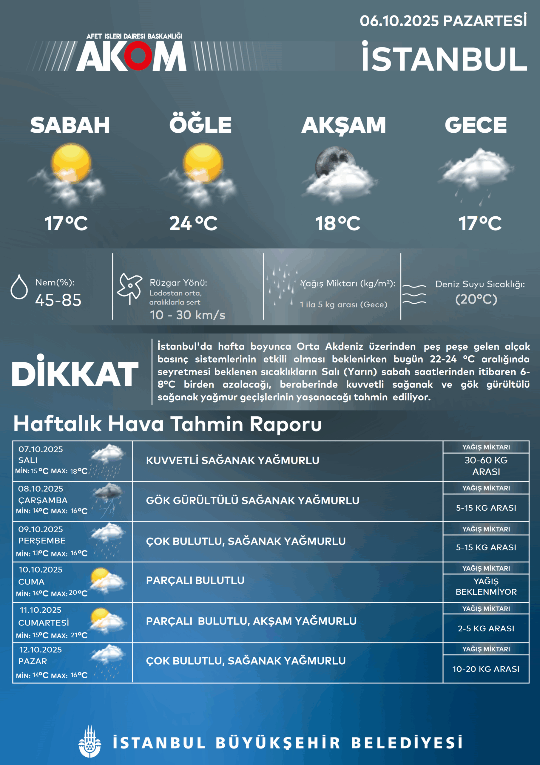 Meteoroloji Genel Müdürlüğü (MGM) ve İstanbul Büyükşehir Belediyesi Afet Koordinasyon Merkezi (AKOM), bu akşamdan itibaren güneybatıdan giriş yapacak yağışlı ve siklonik sistem nedeniyle birçok bölgede ani sıcaklık düşüşü, kuvvetli-rüzgâr, yer yer çok kuvvetli sağanak, dolu ve sel riskine karşı vatandaşlara uyarıda bulundu. MGM’nin bölgesel uyarısına göre Marmara’nın batısı ile Kuzey Ege kıyılarında akşam saatlerinden sonra yerel kuvvetli yağışlar bekleniyor.