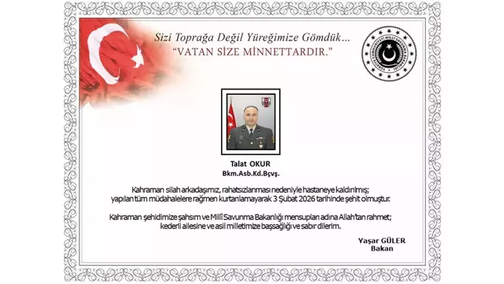 : Milli Savunma Bakanlığı (MSB), Hakkari’nin Şemdinli ilçesinde rahatsızlanarak hastaneye kaldırılan Bakım Astsubay Kıdemli Başçavuş Talat Okur’un, sevk edildiği Şemdinli Devlet Hastanesi’nde yapılan müdahalelere rağmen 3 Şubat 2026 tarihinde yaşamını yitirdiğini açıkladı. Bakan Yaşar Güler de taziye mesajı yayımladı.