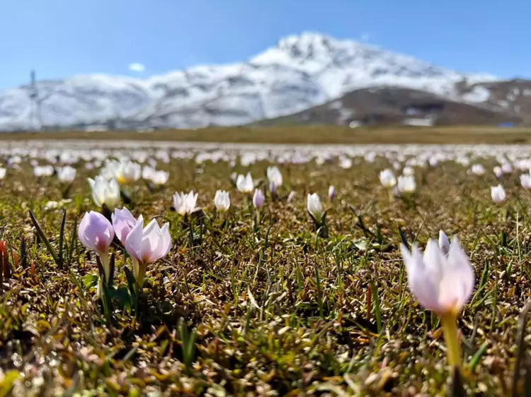 Havaların ısınmasıyla yüzünü gösteren ilk bahar çiçekleri; beyaz, mor ve sarı tonlarında ufak fakat yoğun toplamalar halinde doğayı renklendirdi. Karla kaplı dağ siluetlerinin önünde açan bu çiçekler, bölgeye gelen ziyaretçilere kartpostal gibi görüntüler sundu.