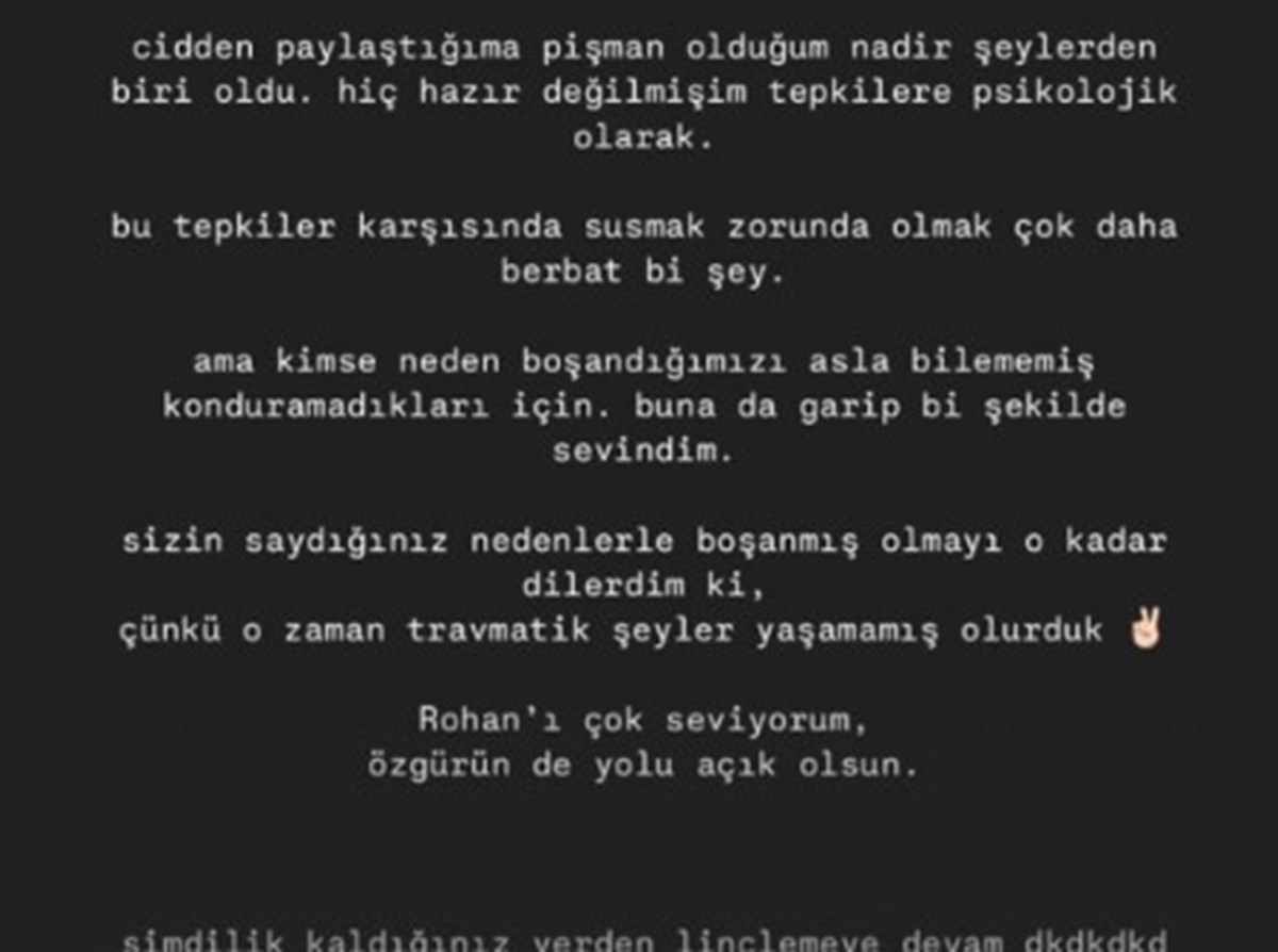 “Cidden paylaştığıma pişman olduğum nadir şeylerden biri oldu. Hiç hazır değilmişim tepkilere psikolojik olarak. Bu tepkiler karşısında susmak zorunda olmak çok daha berbat bir şey. Ama kimse neden boşandığımızı asla bilememiş konduramadıkları için. Buna da garip bir şekilde sevindim. Sizin saydığınız nedenlerle boşanmış olmayı o kadar dilerdim ki, çünkü o zaman travmatik şeyler yaşamamış olurduk. Rohan’ı çok seviyorum. Özgür’ün de yolu açık olsun.”