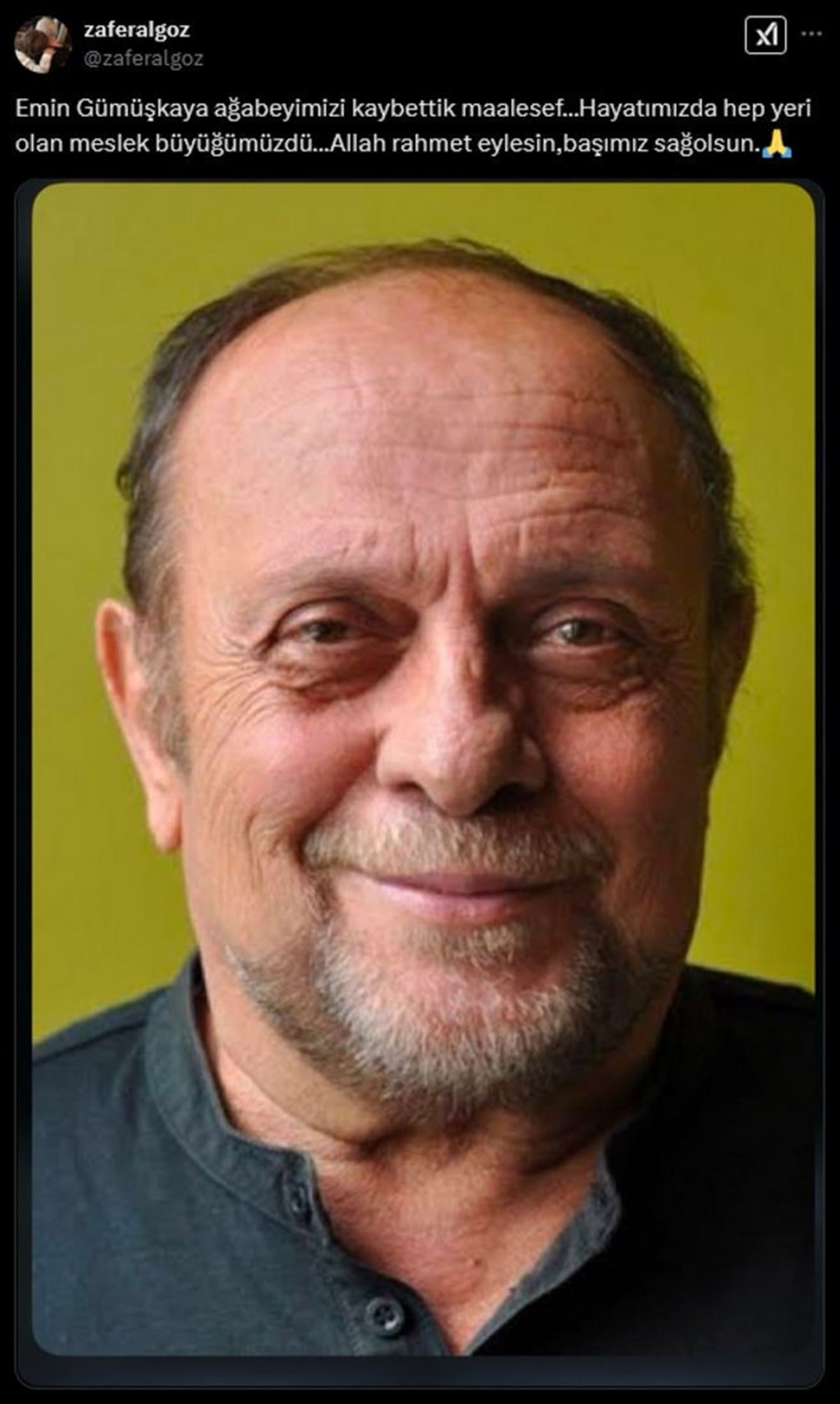 Algöz, sosyal medya hesabında “Emin Gümüşkaya ağabeyimizi kaybettik maalesef. Hayatımızda hep yeri olan meslek büyüğümüzdü. Allah, rahmet eylesin, başımız sağ olsun” ifadelerini kullandı.